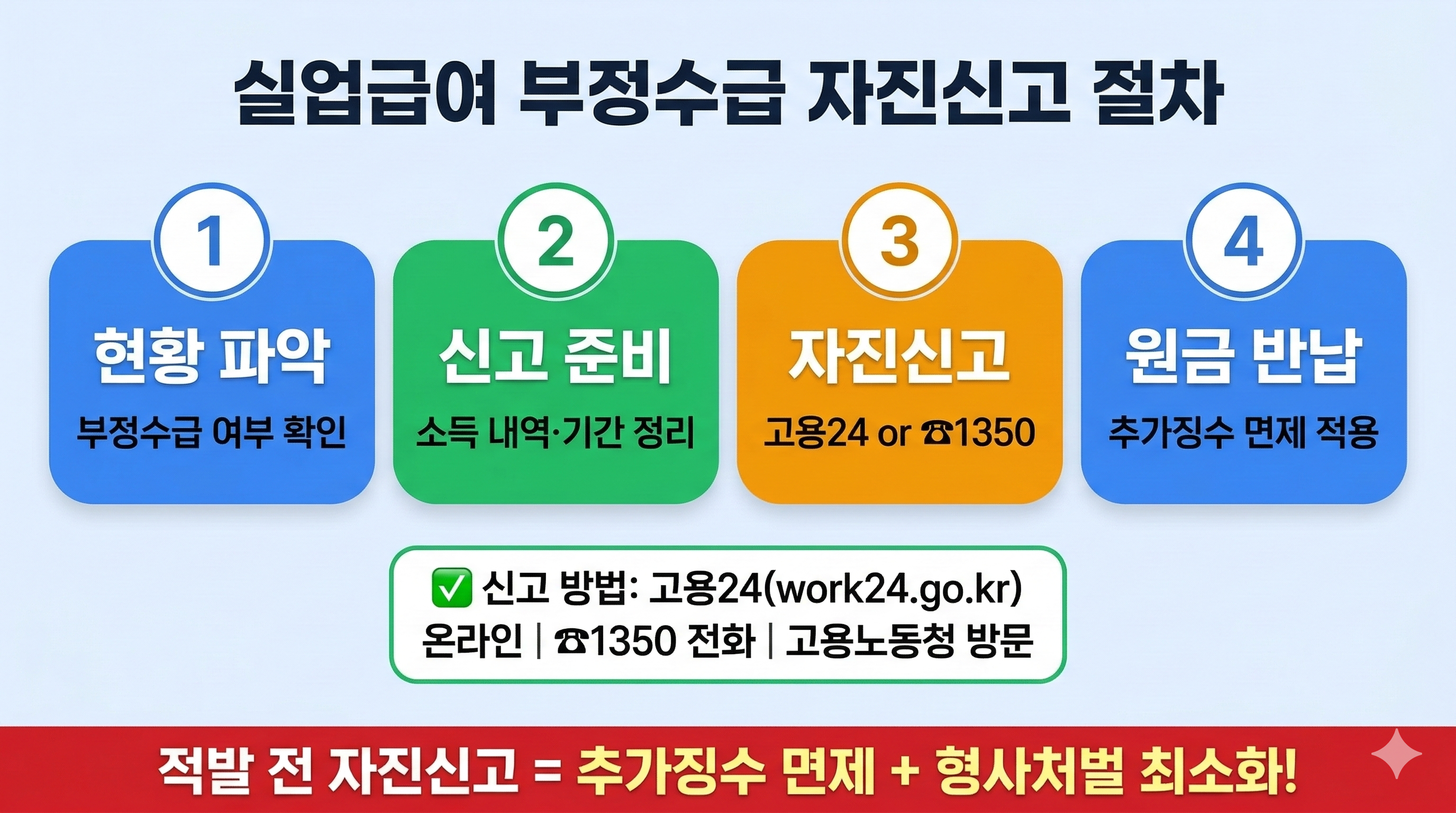 실업급여 부정수급 자진신고 절차 4단계 - 현황 파악, 소득 내역 정리, 고용24 온라인 또는 1350 전화로 자진신고, 원금 반납 및 추가징수 면제 적용