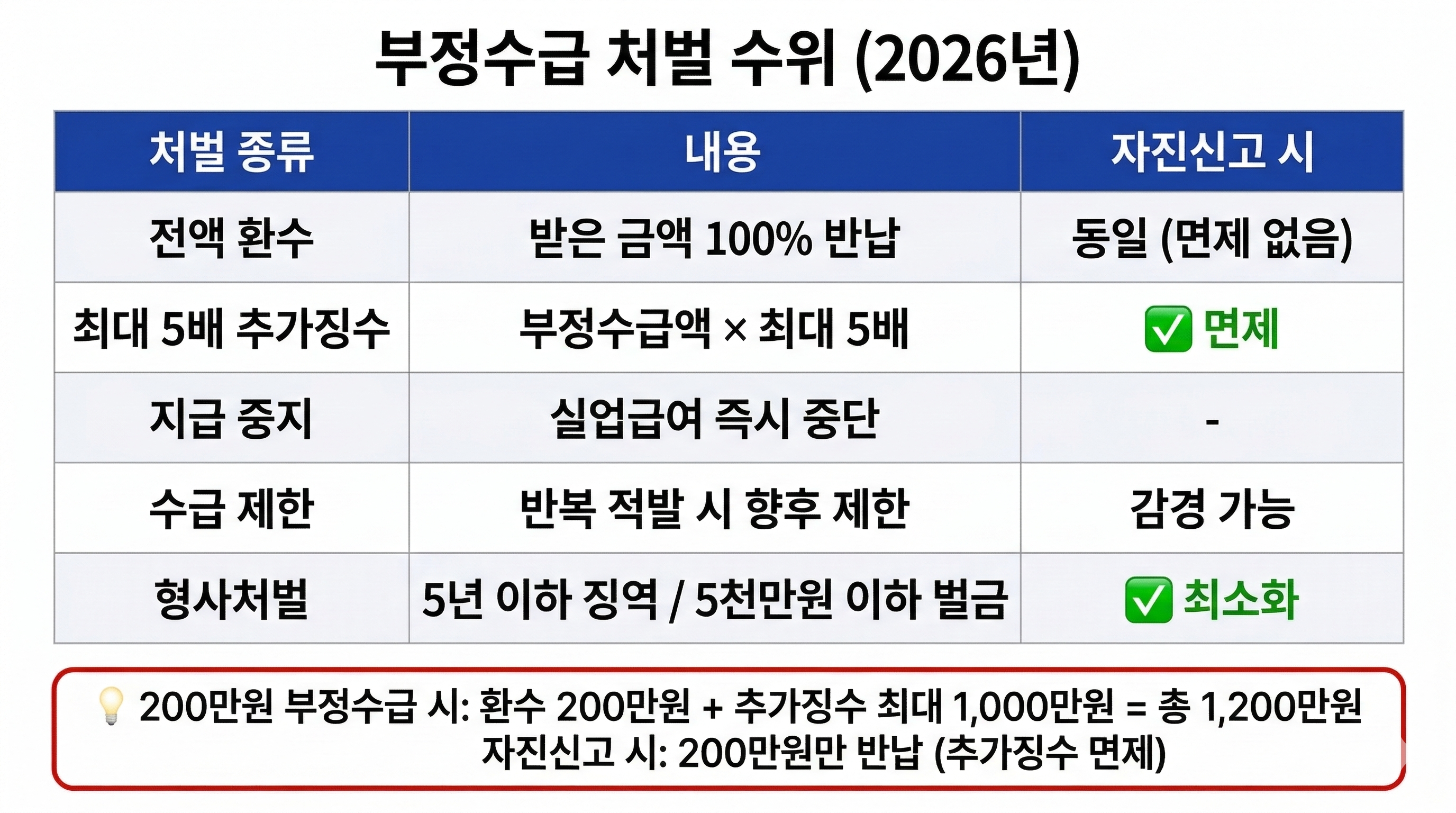 실업급여 부정수급 처벌 수위 2026 - 전액 환수, 최대 5배 추가징수, 수급 제한, 5년 이하 징역 또는 5천만원 이하 벌금, 자진신고 시 추가징수 면제, 200만원 부정수급 시 최대 1200만원 납부