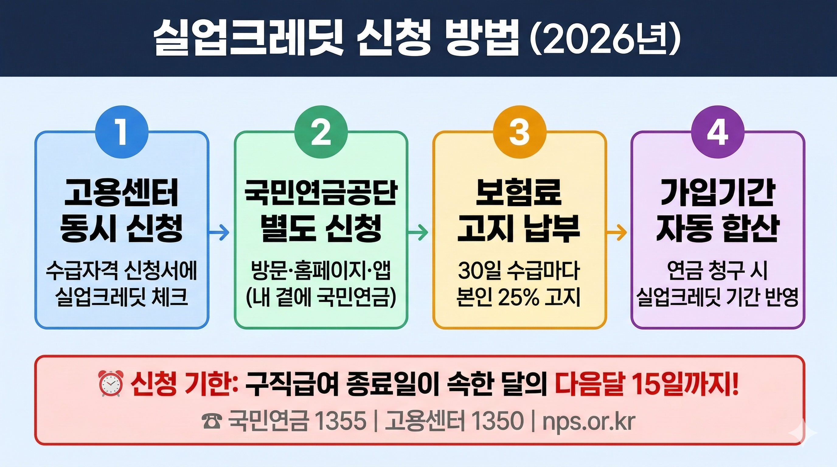 이 글에서는 2026년 기준 실업크레딧 신청 자격, 인정소득 계산 방법, 실제 본인 납부액, 신청 기한, 그리고 고용센터와 국민연금공단에서 각각 어떻게 신청하는지를 빠짐없이 정리합니다.