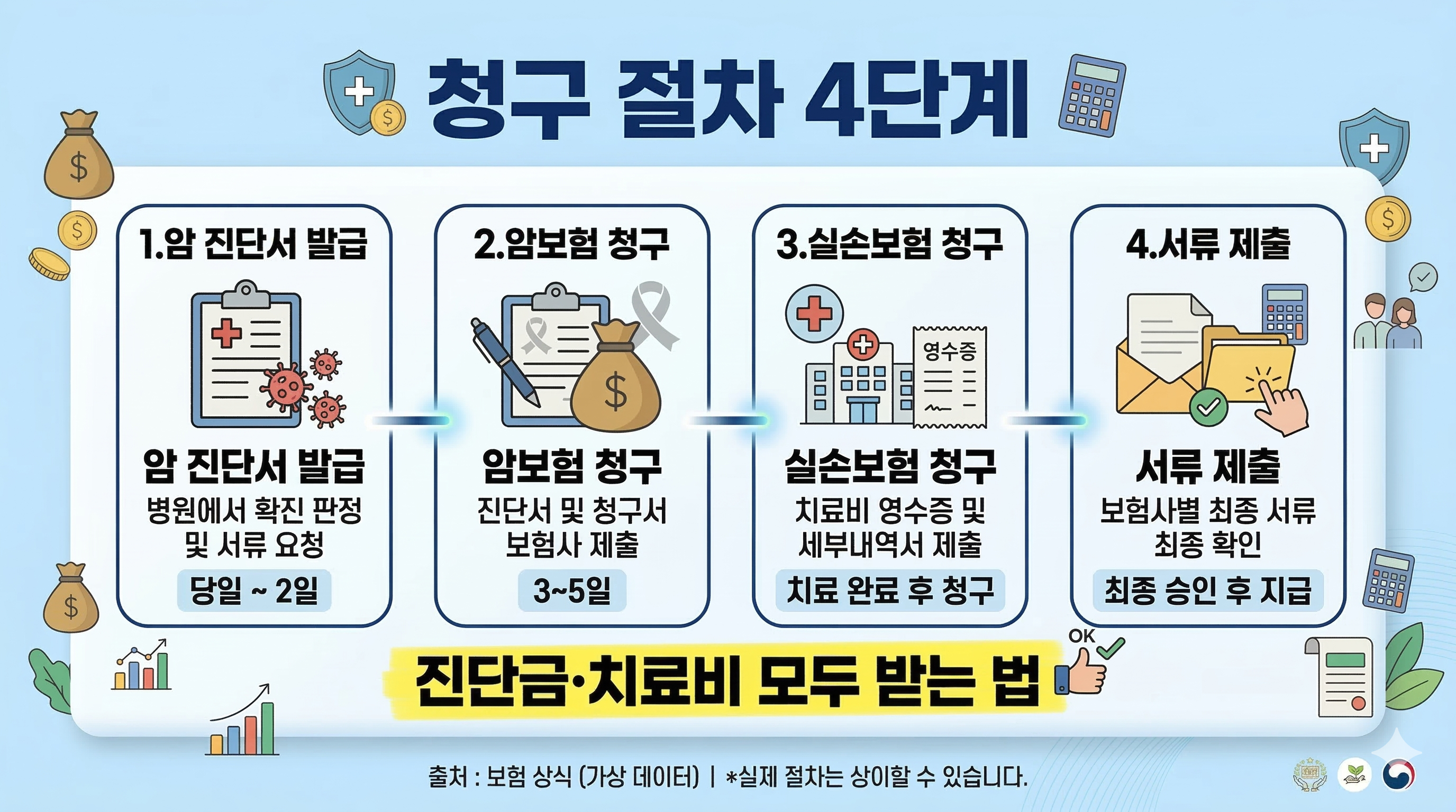 물론 동시 청구도 가능해요. 근데 실손보험은 서류가 많아서 처리가 좀 오래 걸려요. 그래서 암보험으로 먼저 목돈 받고, 실손은 차근차근 챙기는 게 스트레스가 덜해요.