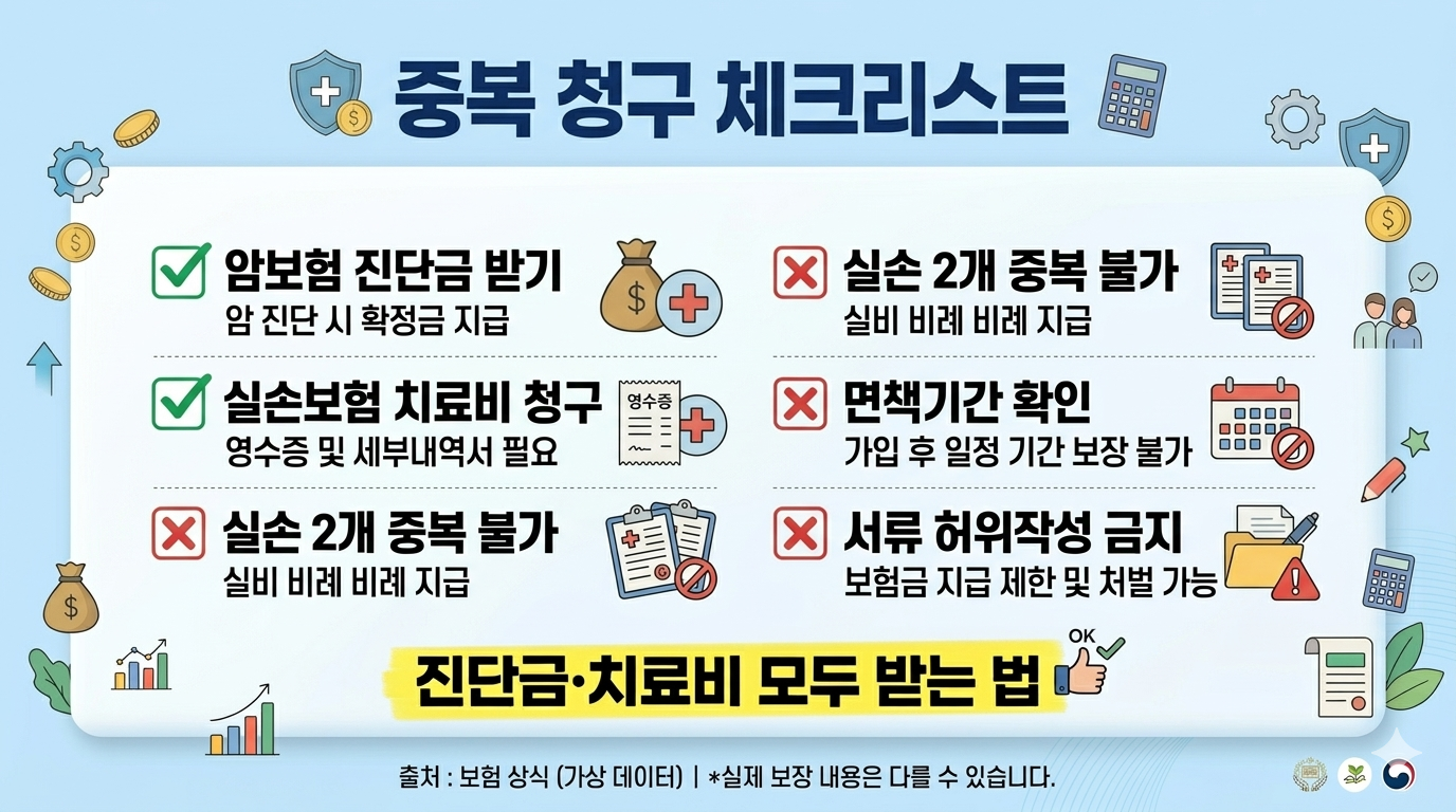 암보험과 실손보험 중복 청구는 가능해요. 암 진단금은 암보험에서 정액으로 받고, 치료비는 실손보험에서 실제 지출액 기준으로 받을 수 있거든요. 2026년 기준으로 두 보험의 보장 범위가 달라서 동시 청구가 허용돼요. 단, 실손보험끼리는 중복 청구가 안 되니까 주의하셔야 해요.