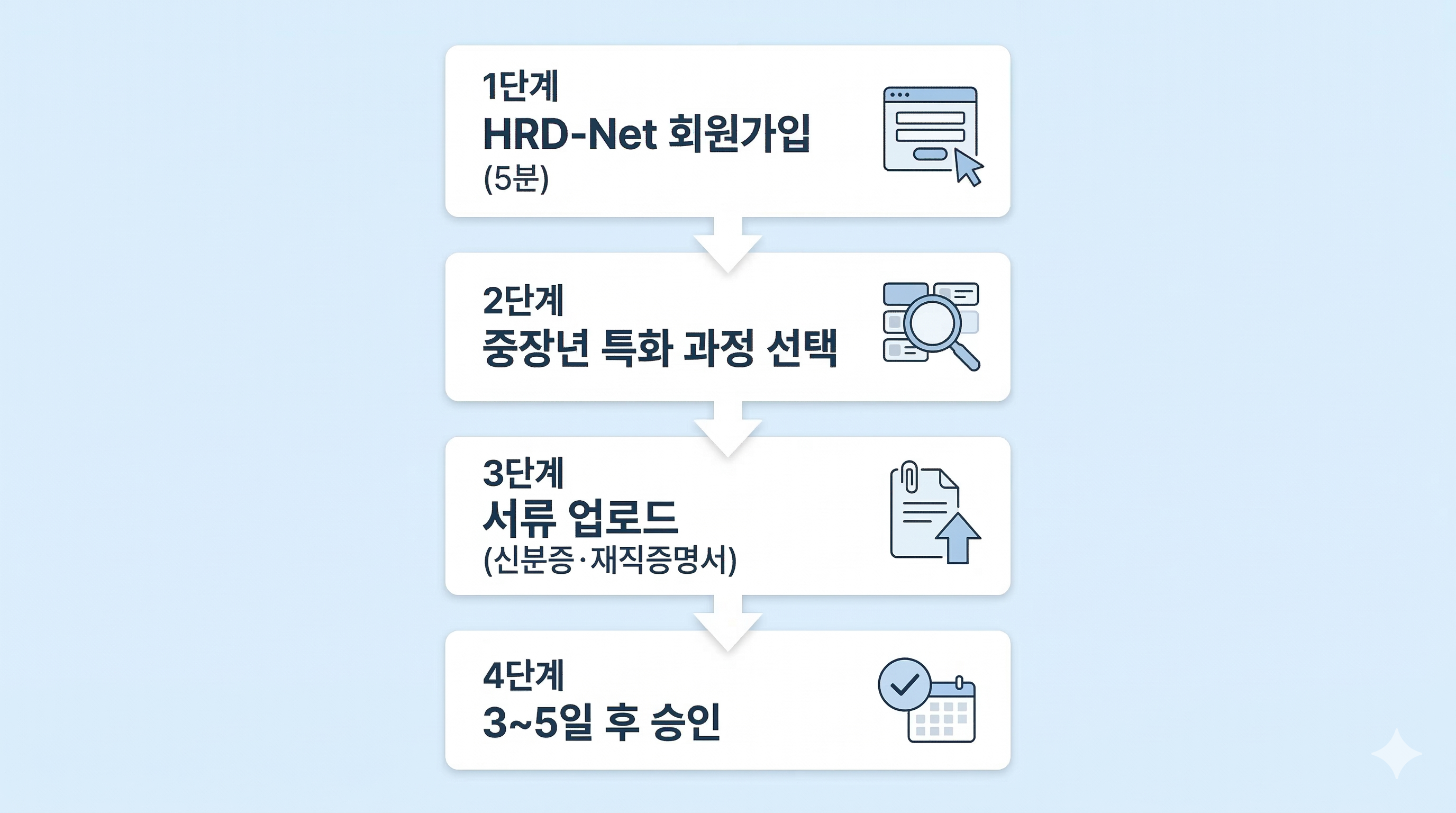 솔직히 300만원이면 적은 돈 아니잖아요. 근데 아무 계획 없이 '이것저것 다 들어보자' 하시면 금방 소진돼요. 저는 먼저 자격증 1개 목표 정하고, 그거 따는 데 필요한 과정만 쏙쏙 골라서 듣는 걸 추천드려요. 예를 들어 요양보호사 되고 싶으시면 요양보호사 과정 하나에 집중하는 거예요. 이것저것 욕심내지 마시고요!일반 국민내일배움카드와 중장년 특화 카드 차이점은?