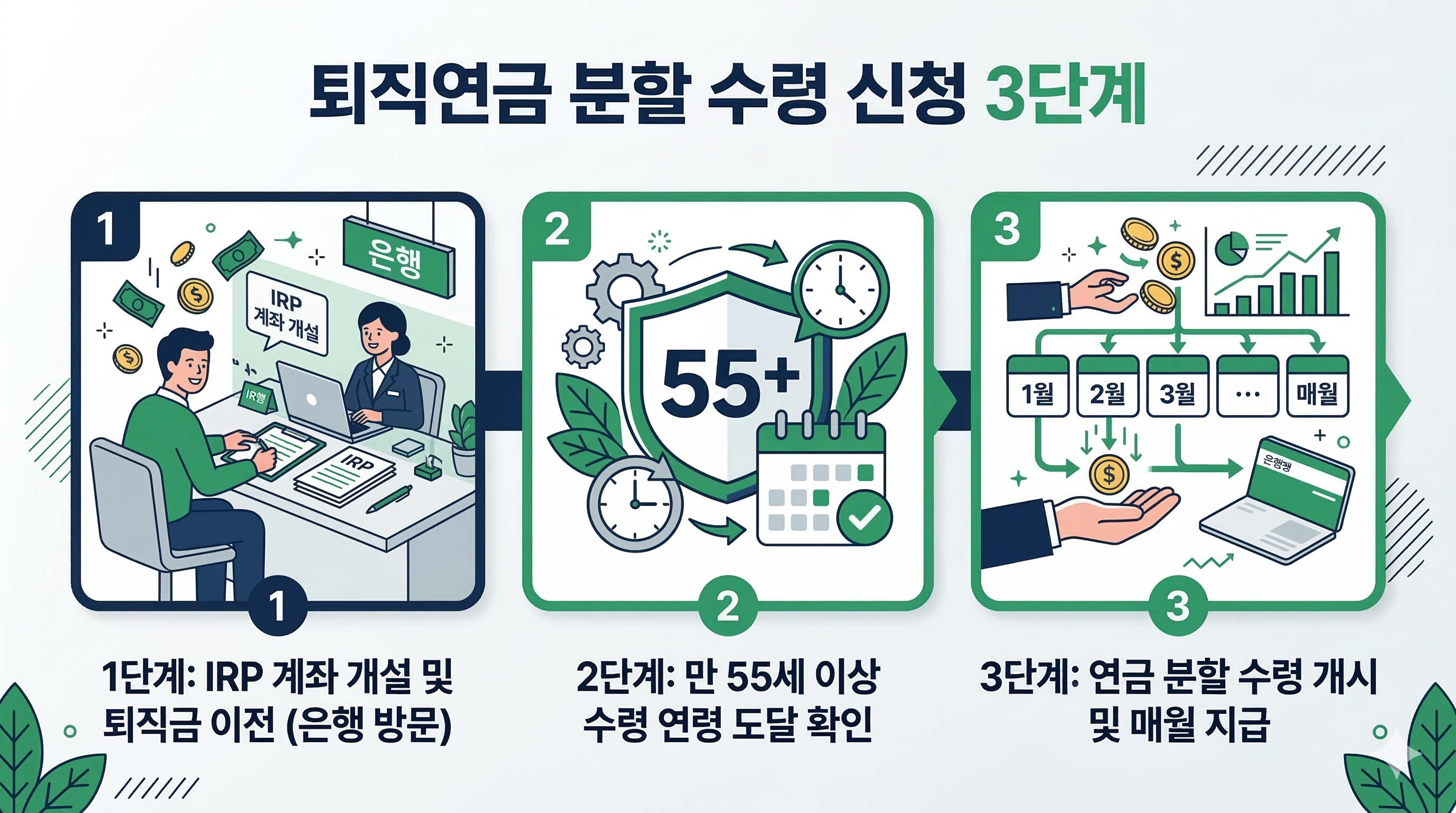 - 연령: 만 55세 이상이어야 합니다. 조기 수령 시 불이익이 있을 수 있습니다.