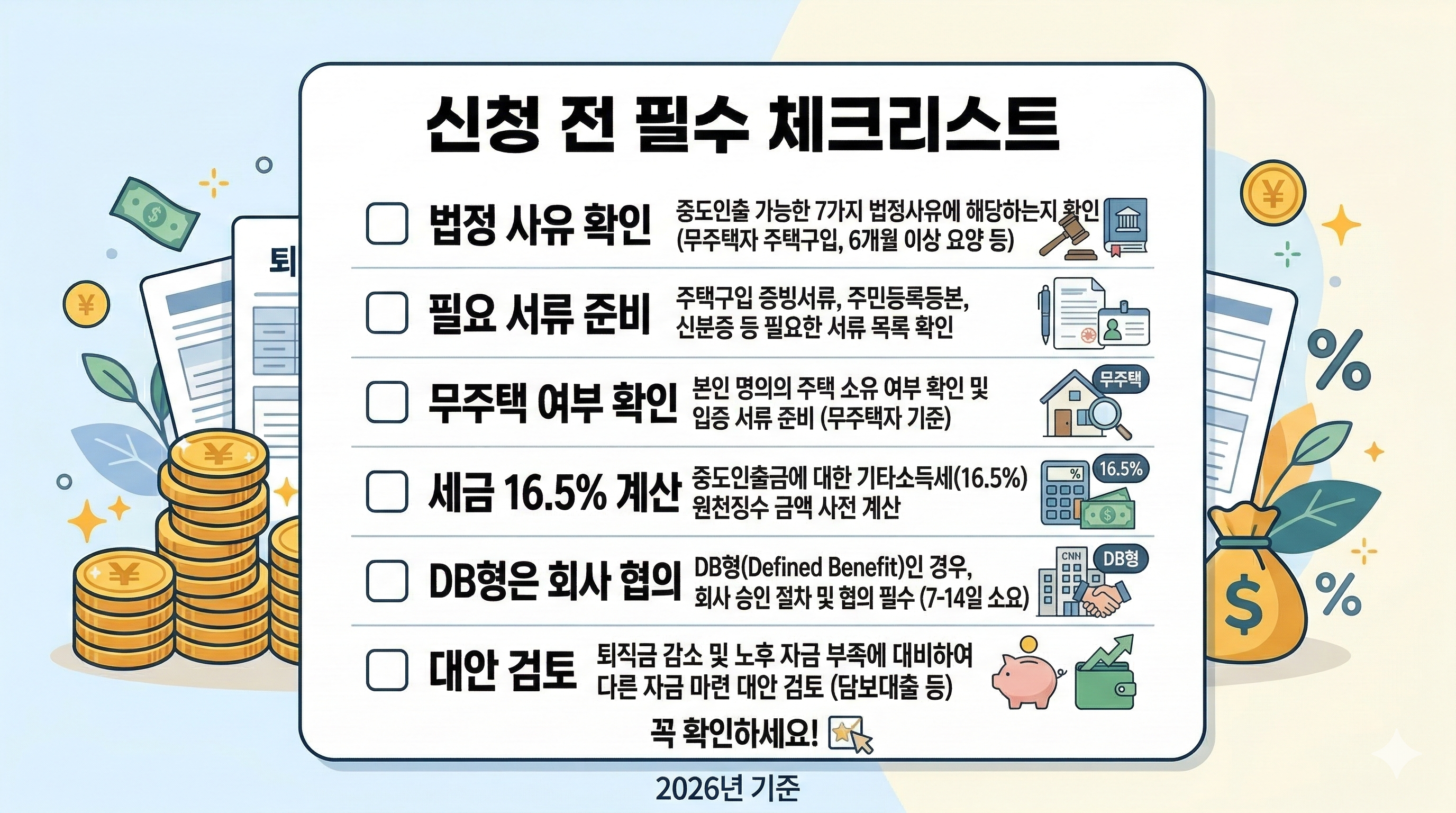 2026년에도 중도인출 조건은 여전히 까다롭지만, 정확히 알고 준비하면 충분히 받을 수 있습니다. 이 글이 여러분의 성공적인 신청에 도움이 되길 바랄게요!