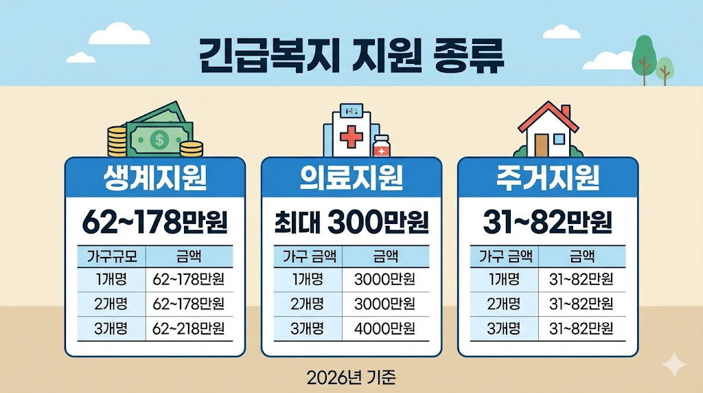 2026년 긴급복지 지원 금액은 가구원 수에 따라 차등 지급되며, 생계지원은 1개월분, 의료·주거는 최대 12개월까지 반복 신청이 가능합니다.