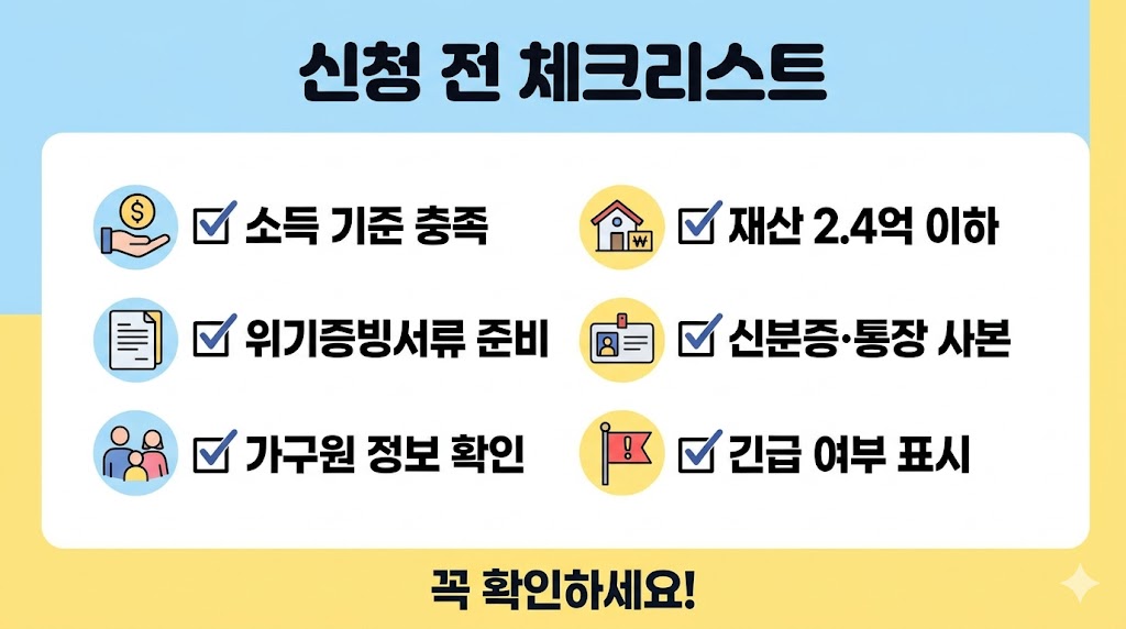 주민센터 방문 시에는 신분증, 통장 사본, 위기증빙서류(실직확인서, 진단서 등)만 들고 가면 됩니다. 현장에서 신청서 작성 도와주고, 서류가 부족하면 나중에 제출해도 돼요. 급한 경우엔 '선지원 후조사' 제도로 신청 당일 지원금 받을 수도 있거든요.