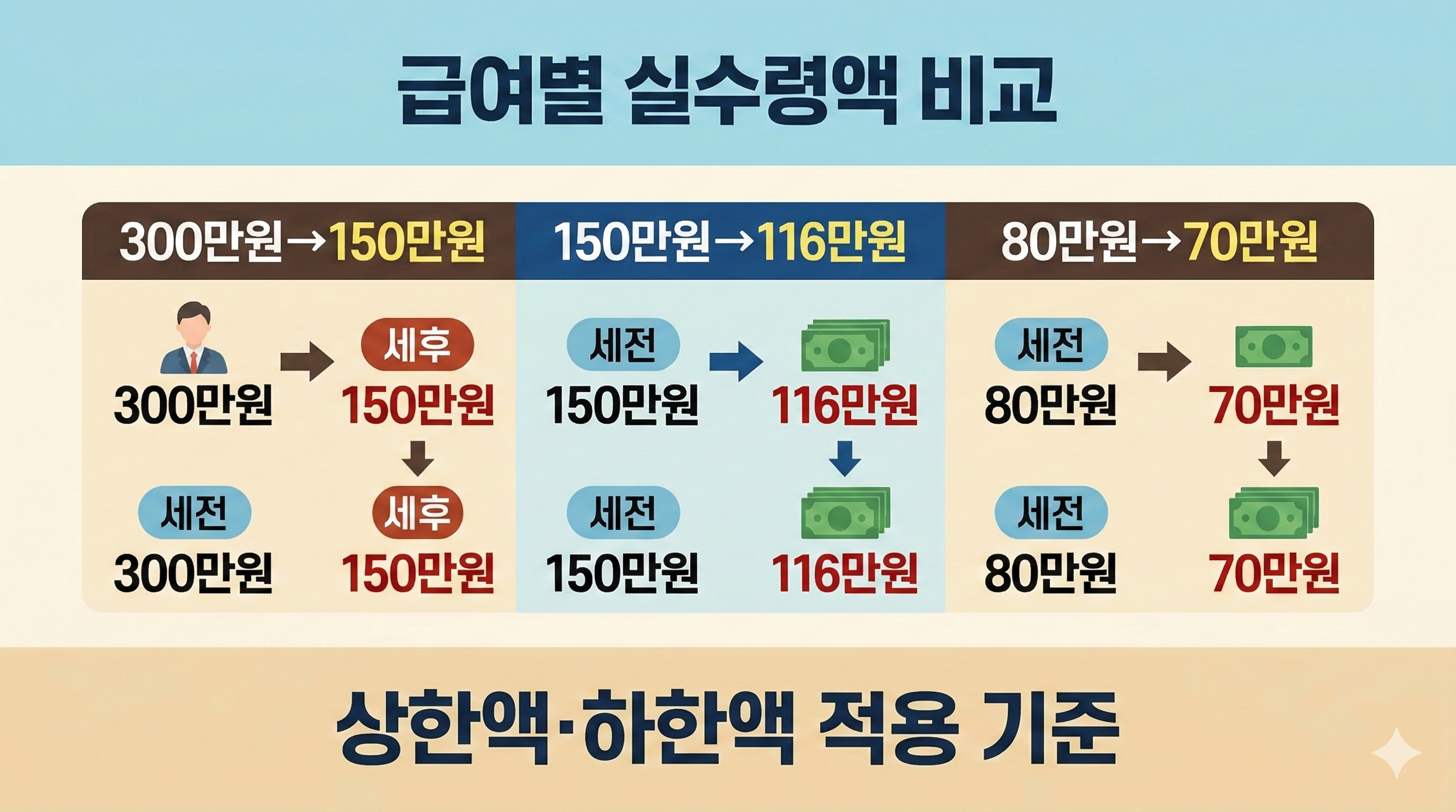 300만원 × 80% = 240만원이지만, 상한액인 150만원만 받게 돼요. 반대로 월급이 80만원이면 80만원 × 80% = 64만원인데, 이건 하한액 70만원보다 적으니까 70만원을 받습니다.