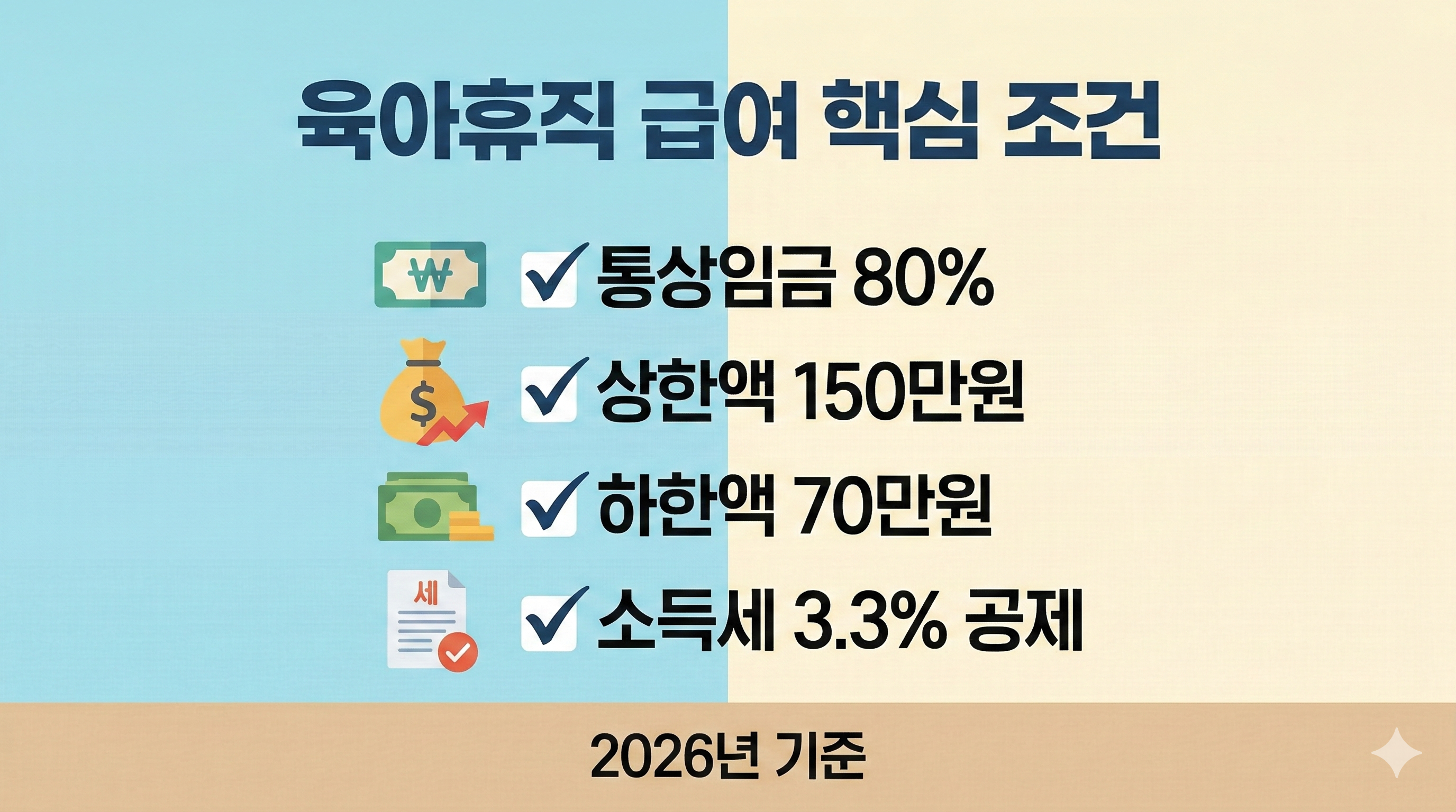 육아휴직 급여는 육아휴직 시작일 기준 통상임금의 80%를 지급합니다. 근데 여기서 중요한 건, 무조건 80%를 다 받는 게 아니라 상한액과 하한액이 정해져 있다는 거예요. 2026년 기준으로 상한액은 월 150만원, 하한액은 70만원으로 적용되거든요.